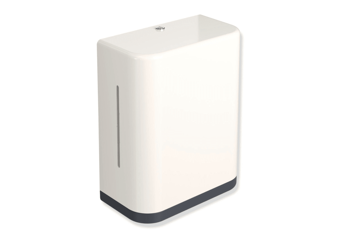 Korpus aus hochglänzendem Polyamid in der HEWI Farbe 99 (Reinweiß), Rahmenelement / Entnahmeöffnung ausaus hochwertigem, mattem Polyamid, Breite 287 mm, Höhe 354 mm, Tiefe 153 mm, zur Aufnahme von handelsüblichen Papierhandtüchern verschiedener Falzungen in der Breite 235 - 250 mm und gefalteter Länge / Tiefe von 80 - 110 mm (HEWI empfiehlt Papierhandtücher mit Z-Falz), Füllmenge ca. 300 - 450 Stück.