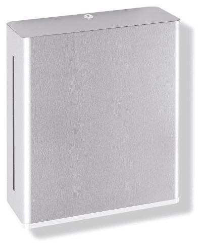 Ein kubischer Grundkörper mit eingerücktem Wandsockel, dient zur Aufnahme von handelsüblichen Papierhandtüchern verschiedener Falzungen in der Breite 240 - 250 mm und gefalteter Länge / Tiefe von 90 - 100 mm (HEWI empfiehlt Papierhandtücher mit C-Falz in Lagenfaltung), Füllmenge ca. 300 - 450 Papierhandtücher, 301 mm breit, 360 mm hoch und 120 mm tief, Wandsockel 15 mm tief, aus hochwertigem Edelstahl, Oberfläche matt geschliffen, Entnahmeöffnung aus hochwertigem Polyamid in den HEWI Farben 90 (Tiefschwarz), 92 (Anthrazitgrau), 98 (Signalweiß) oder 99 (Reinweiß).
