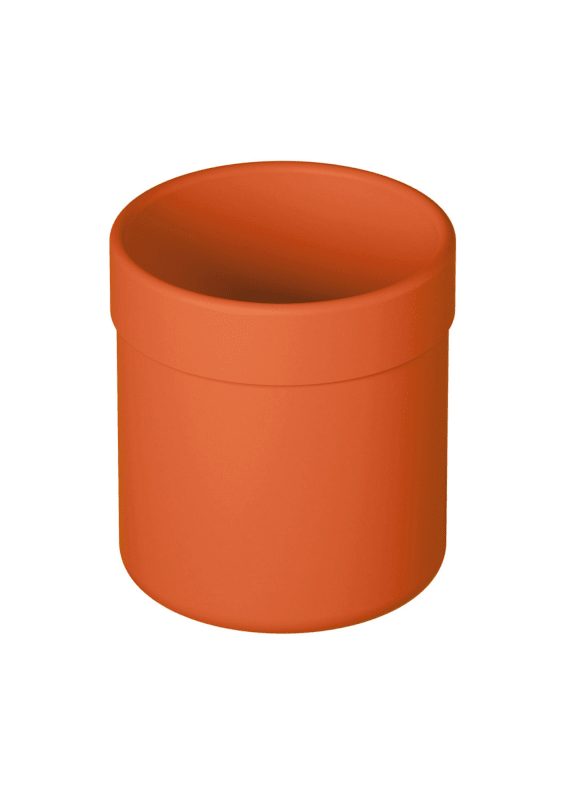 runder Becher mit flachem Boden, freistehend und geeignet als Einsatz für den kleinen Halter, 80 mm hoch und 73 mm im Durchmesser, aus hochwertigem, mattem Polyamid in den HEWI Farben 99 (Reinweiß), 98 (Signalweiß), 97 (Lichtgrau), 95 (Felsgrau), 92 (Anthrazitgrau), 55 (Aquablau) und 36 (Koralle)