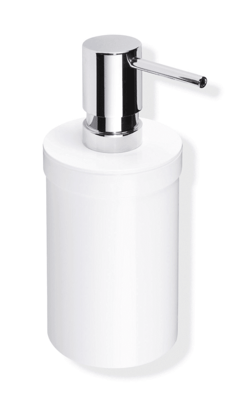 aus hochwertigem Polyamid nach HEWI Farbtabelle, mit einer Pumpe aus Metall, hochwertig verchromt, passend zu Ablagen mit Loch 950.13.00.. und Halter 800.00.10090 und Produkt-Set 800.06.11041, 815.06.110, 815.06.11090, 162.06.110.... oberer Durchmesser 69 mm, 170 mm hoch inkl. Pumpe, Füllmenge ca. 200 ml.