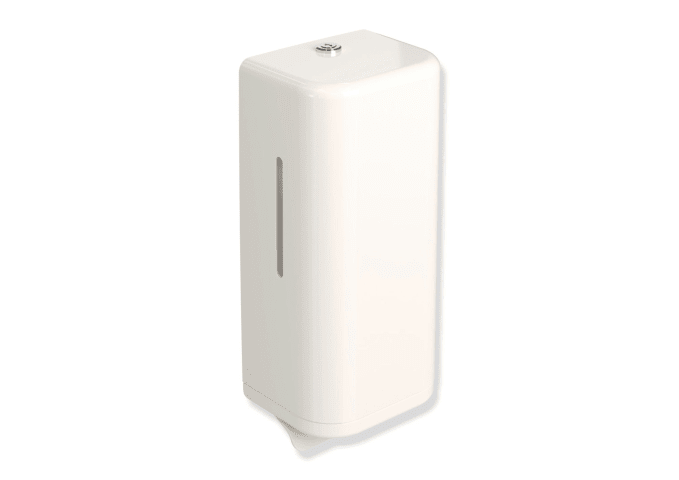 Korpus und Hebel aus hochglänzendem Polyamid in der HEWI Farbe 99 (Reinweiß), Rahmenelement aus hochglänzendem Polyamid, Füllmenge 600 ml, Breite 134 mm, Höhe 278 mm, Tiefe 106 mm.