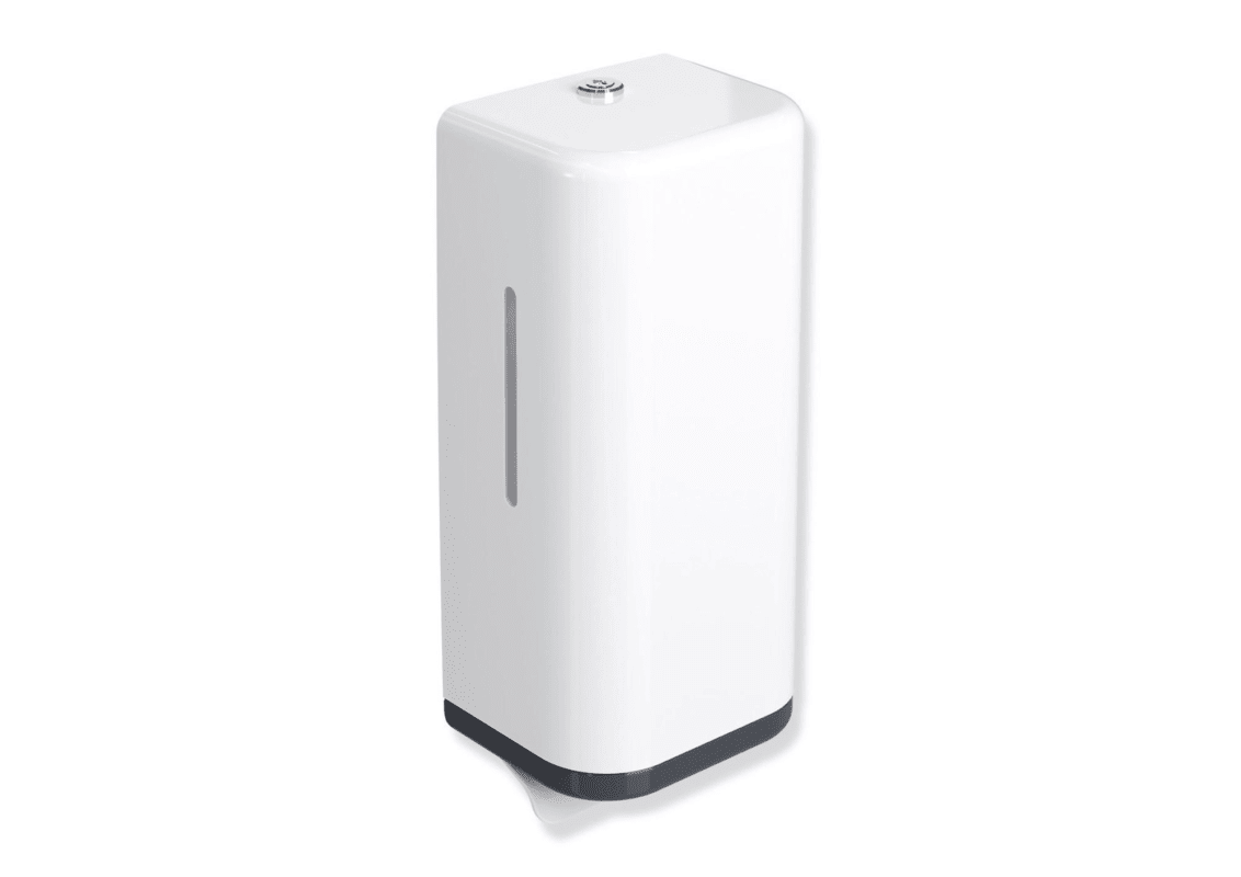 Korpus und Hebel aus hochglänzendem Polyamid in der HEWI Farbe 98 (Signalweiß), Rahmenelement aus hochwertigem, mattem Polyamid, Füllmenge 600 ml, Breite 134 mm, Höhe 278 mm, Tiefe 106 mm.
