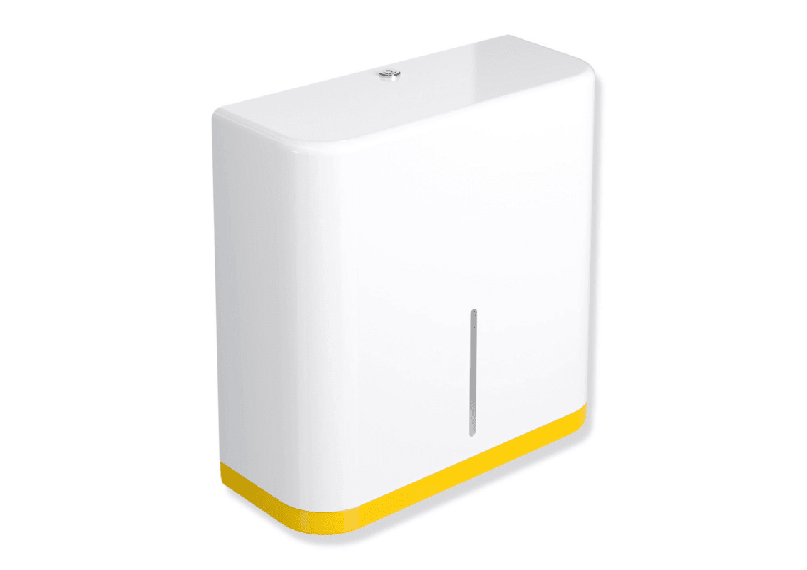 Korpus aus hochglänzendem Polyamid in der HEWI Farbe 98 (Signalweiß), Rahmenelement / Entnahmeöffnung aus hochglänzendem Polyamid, Breite 360 mm, Höhe 364 mm, Tiefe 147 mm, Schutz gegen Missbrauch durch Verriegelung, Erweiterung durch Karussel 900.21.E01 möglich.