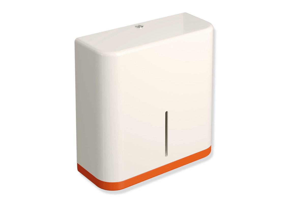 HEWI WC-GroßrollenhalterKorpus aus hochglänzendem Polyamid in der HEWI Farbe 99 (Reinweiß), Rahmenelement / Entnahmeöffnung aus hochwertigem, mattem Polyamid, Breite 360 mm, Höhe 364 mm, Tiefe 147 mm,