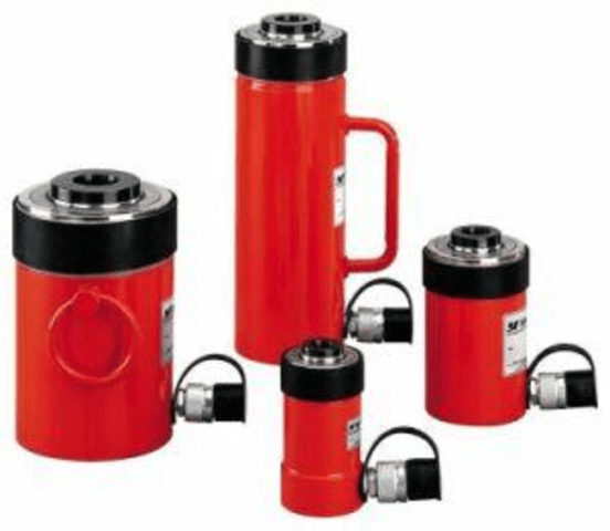 Hohlkolbenzylinder, einfach wirkend mit Federrückzug • Gehäuse und Kolben: Chrom-Molybdänstahl, vergütet • Führung: Bronzeführung der Kolbenstange • Für hohe Zugkräfte: Mittelbohrung durchgehend, für Einsatzbereiche, in denen hohe Zugkräfte mittels Gewindespindeln aufgebracht werden müssen • Befestigungsgewinde: metrisch • Betriebsdruck: 700 bar Lieferung: inklusive Kupplungsmuffe(n), Staubkappe und Druckstück, größere Zylinder mit Tragegriffen/Trageösen. Hinweis: Zylinder mit Druckkräften bis 1000 kN (100 t) auf Anfrage lieferbar.
