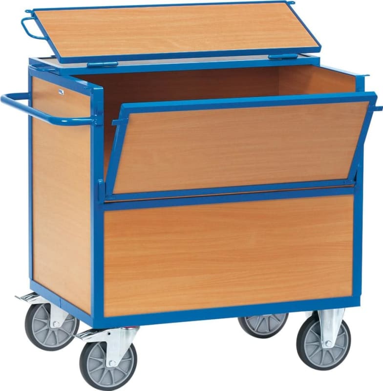 Kastenwagen (Holzwände) mit abklappbarer Wand und Deckel • Stahlrohr-/Profilstahl-Konstruktion: geschweißt, pulverbeschichtet in RAL 5007 brillantblau • Deckel: zweifach klappbar, mit Ring-Ösen für Vorhängeschlösser • Rollen: 2 Bockrollen, 2 Lenkrollen mit Feststeller, gemäß der Europäischen Norm EN 1757-3 (Sicherheit von Plattformwagen) • Räder: TPE-Bereifung, 200 x 50 mm, leichtlaufend • Naben: Rillenkugellager Hinweis: Fest verschweißte Ausführung.