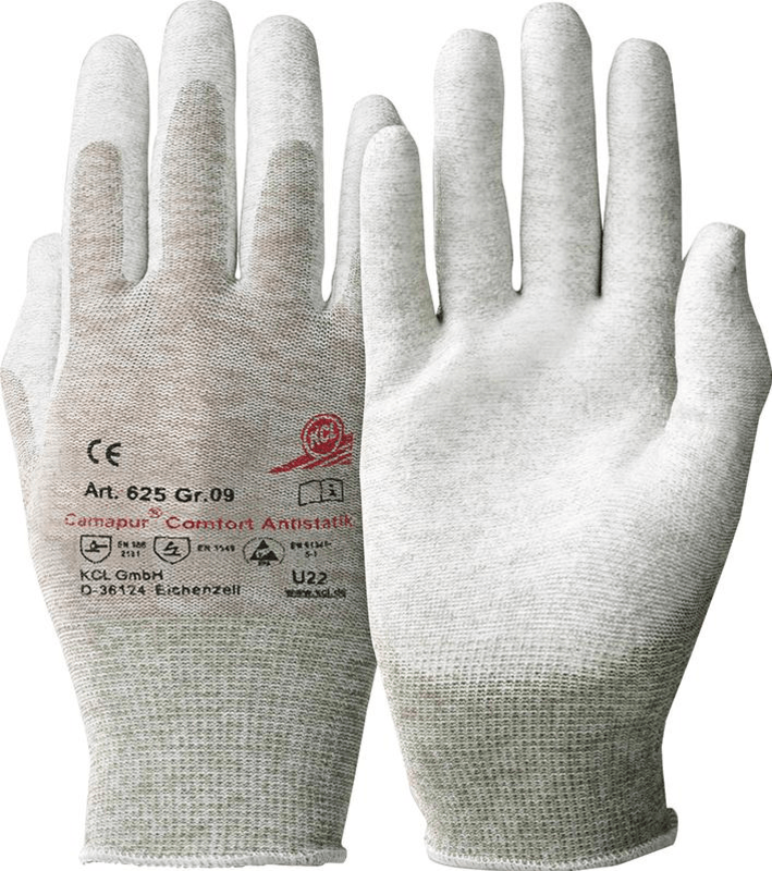 Camapur Comfort Antistatik 625Material: Polyurethan, Polyamid, Kupfer, nahtloses Trikot, Strickbund, handrückenfrei.Eigenschaften: hohe Atmungsaktivität, exzellente Passform, extrem gute Feinfühligkeit, griffsicher bei ölbenetzten Teilen, geraute PU-Beschichtung.Erfüllt Forderung der EN 61340 Ableitfähigkeit, frei von Weichmachern, hautsympathisch durch hautneutrale Inhaltsstoffe.Einsatzgebiete: für Montagetätigkeiten, Elektroindustrie, Produktschutz, Automobil- und Zuliefererindustrie, Chipbe- und -verarbeitung. Schutz nach Kategorie 2.