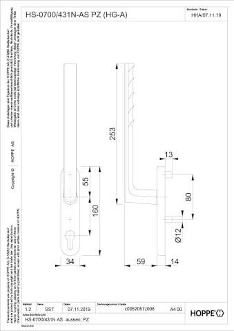 Hebeschiebe- Handhebelgarnitur, Hamburg HS-0700/431N-AS außen, Profilzylinder gelocht, Aluminium, naturfarbig eloxiert