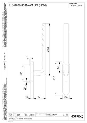 Hebeschiebe- Handhebelgarnitur, Hamburg HS-0700/431N-AS innen, ungelocht, Aluminium, naturfarbig eloxiert
