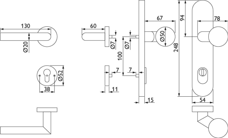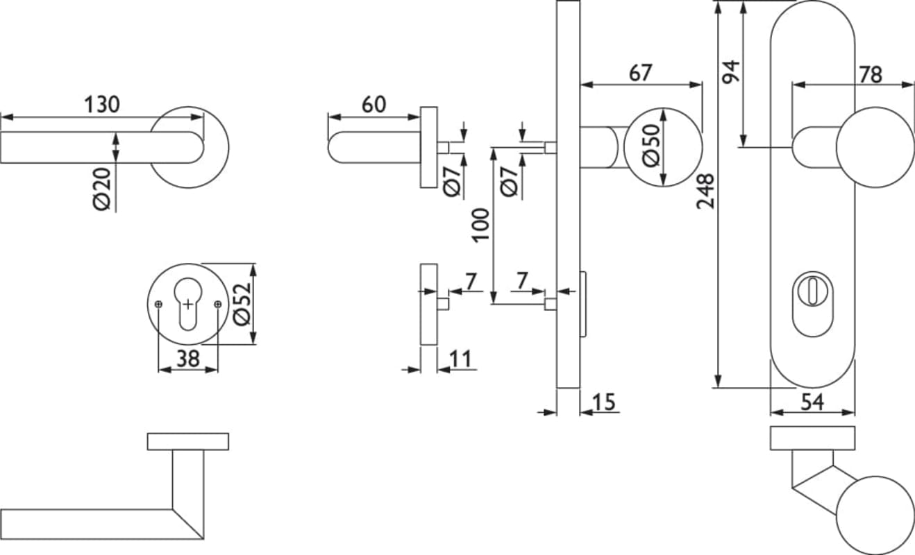 HT-EN2-Kombi-Schutz-Wechselgarnitur 1802 BASIC 02, außen Langschild 2089 KSH, Knopf 3126 gekröpft, innen Rosette 2336 SC, PZW 92 links, Tst. 64-83 mm, mit Kernziehschutz für Zylinderüberstand 8 - 15 m