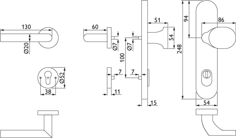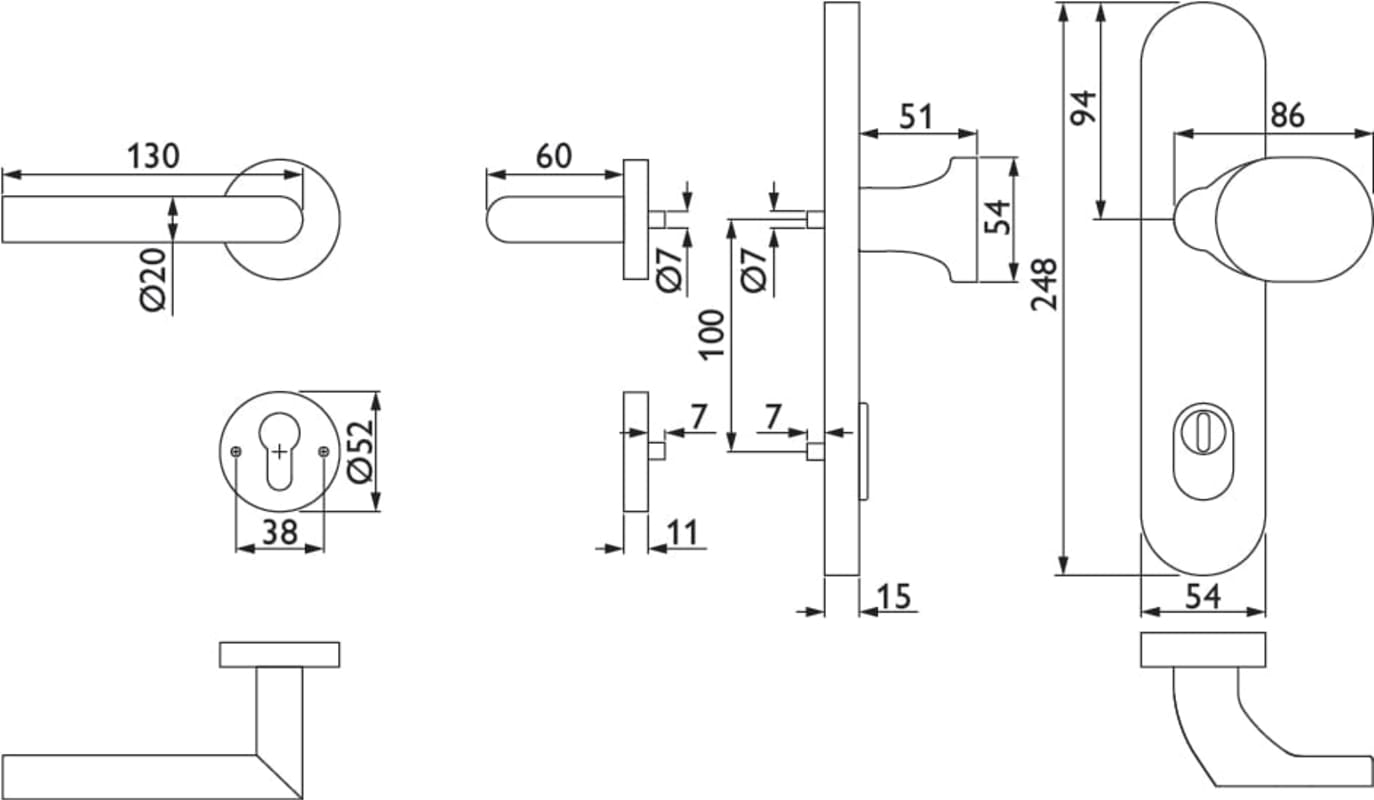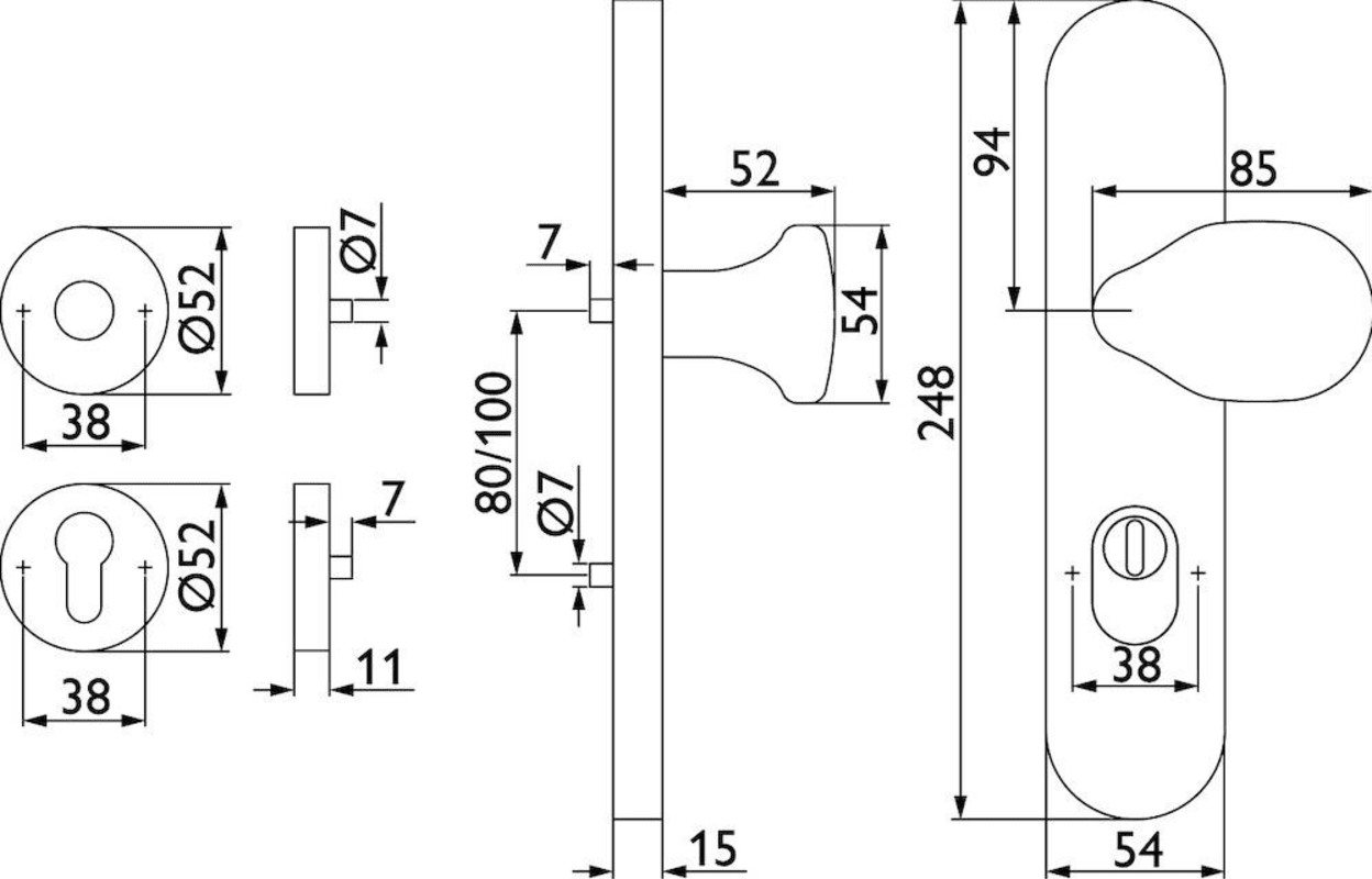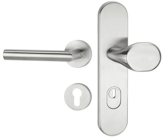 HT-EN2-Kombi-Schutz-Wechselgarnitur 1802 BASIC 02, außen Langschild 2089 KSH, Knopf 3128 gekröpft, innen Rosette 2336 SC, PZW 92 mm, Tst. 64 - 83 mm, mit Kernziehschutz für Zylinderüberstand 8 - 15 mm