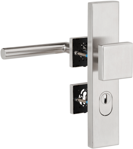 HT-EN2-Kombi-Schutz-Wechselgarnitur 1802 BASIC 02, außen Langschild 2094 KSH, Knopf 3132 gekröpft, innen Rosette 2311 SC, PZW 92 links, Tst. 64-83 mm, mit Kernziehschutz für Zylinderüberstand 8 - 15 m