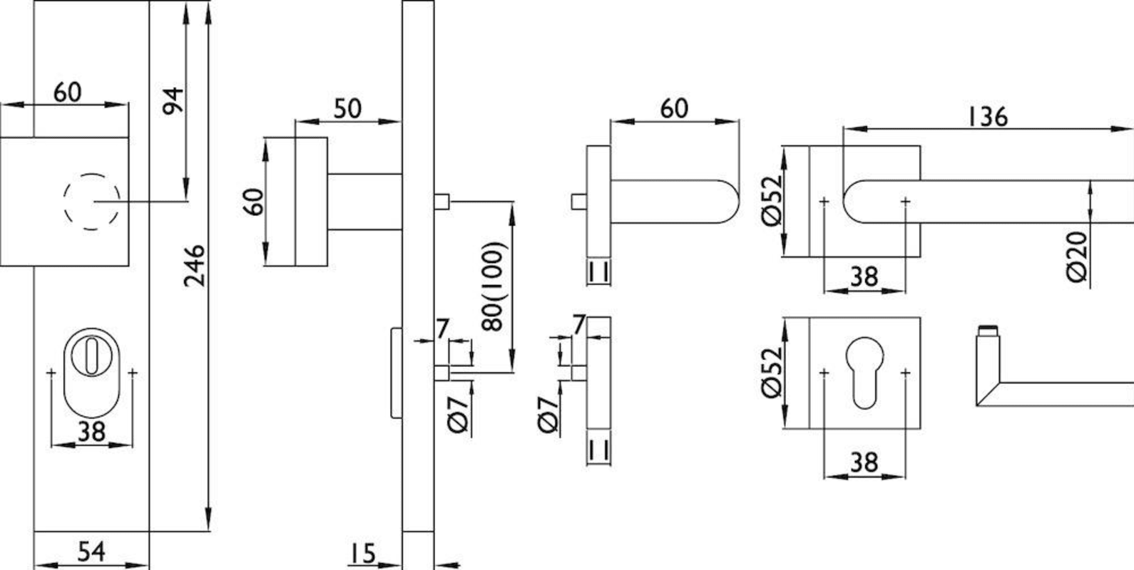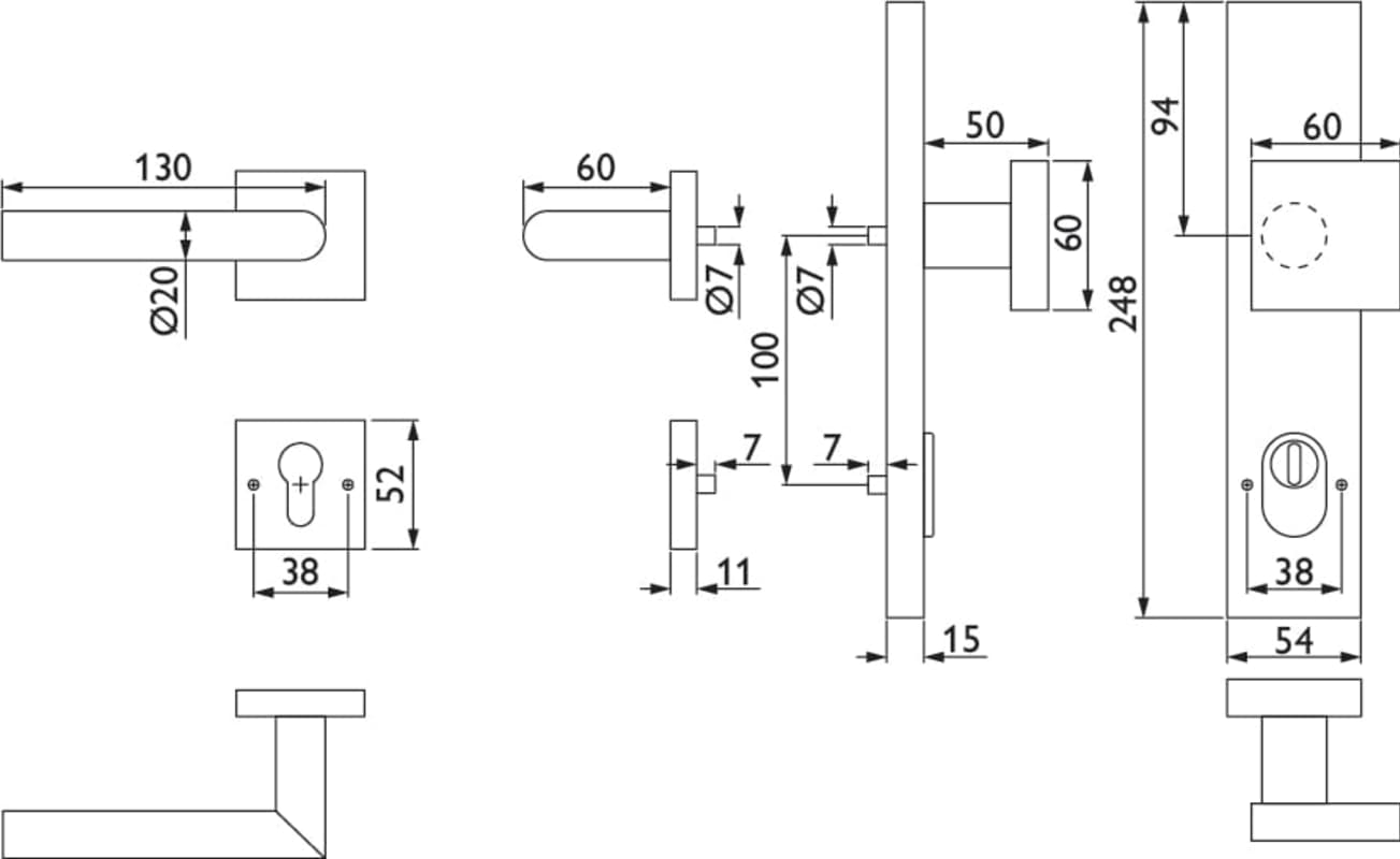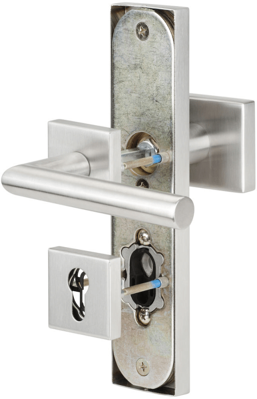 HT-EN2-Kombi-Schutz-Wechselgarnitur 1802 BASIC 02, außen Langschild 2094 KSH, Knopf 3132 gekröpft, innen Rosette 2311 SC, PZW 92 links, Tst. 64-83 mm, mit Kernziehschutz für Zylinderüberstand 8 - 15 mm, Oberfl. 60 (Edelstahl matt)