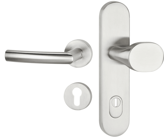 HT-EN2-Kombi-Schutz-Wechselgarnitur 1807 BASIC 07, außen Langschild 2091 KSH, Knopf 3128 gekröpft, innen Rosette 2336 SC, PZW 92 mm, Tst. 57 - 77 mm, mit Kernziehschutz für Zylinderüberstand 9 - 14 mm, Oberfl. 60 (Edelstahl matt)