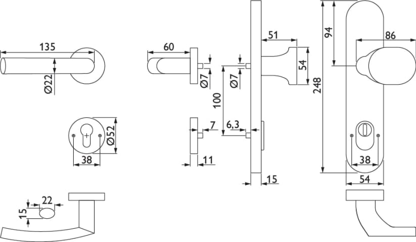 HT-EN2-Kombi-Schutz-Wechselgarnitur 1807 BASIC 07, außen Langschild 2091 KSH, Knopf 3128 gekröpft, innen Rosette 2336 SC, PZW 92 mm, Tst. 57 - 77 mm, mit Kernziehschutz für Zylinderüberstand 9 - 14 mm