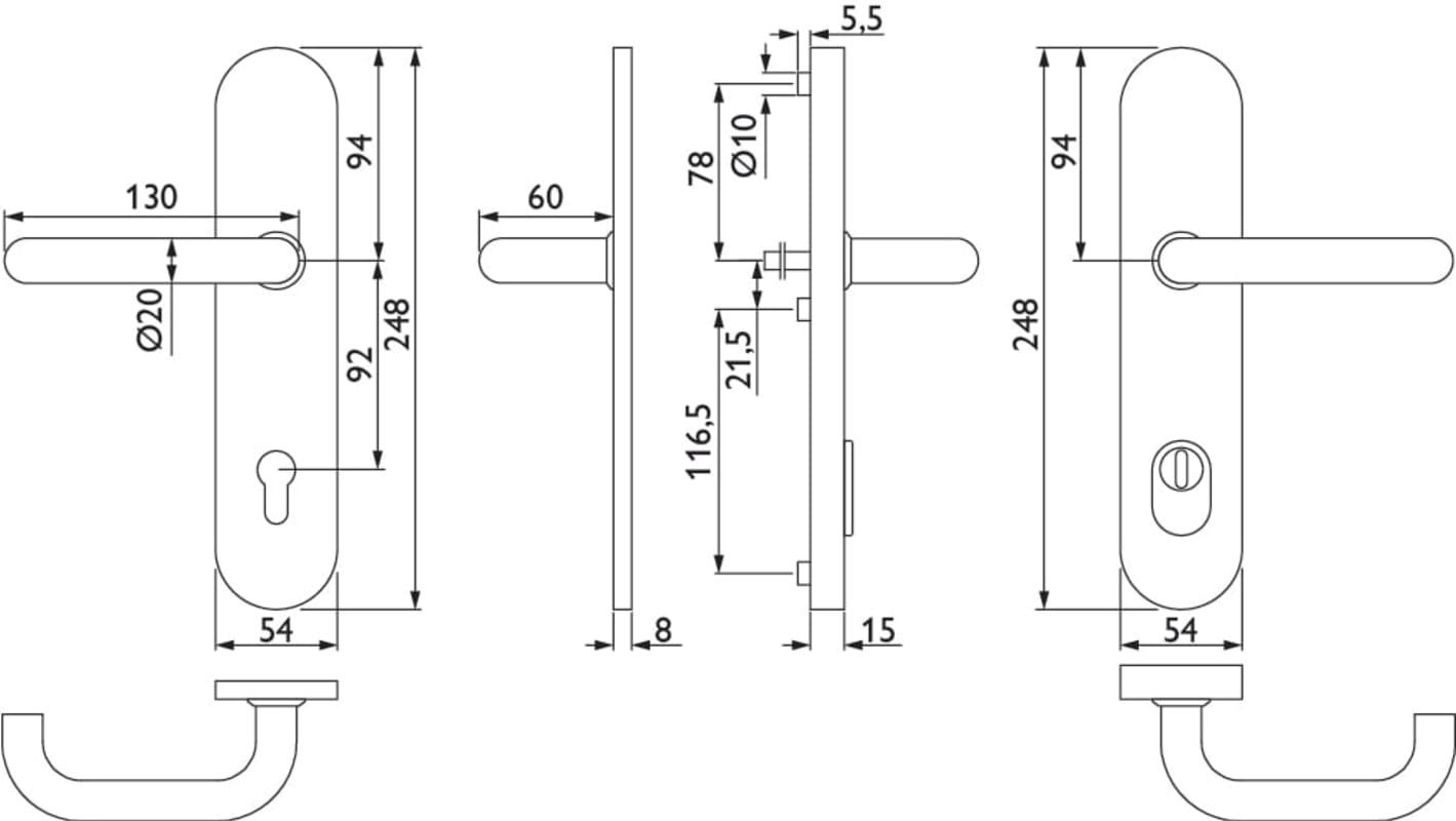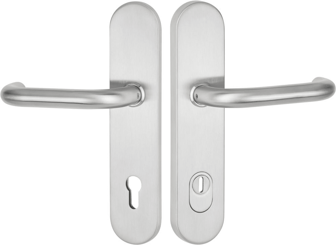 HT-EN2-Schutz-Drückergarnitur 1801 BASIC 01, mit Langschild 2089 KSH, Ausf.: PZ 92 mm, Türstärke 64 - 83 mm, mit Kernziehschutz für Zylinderüberstand 8 - 15 mm, Oberfl. 60 (Edelstahl matt)