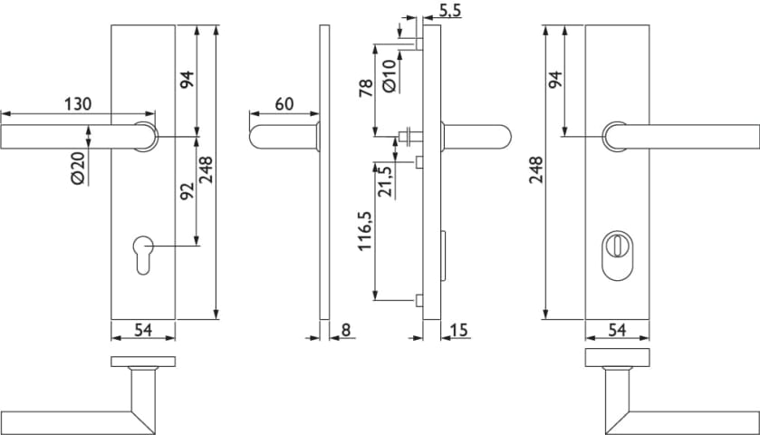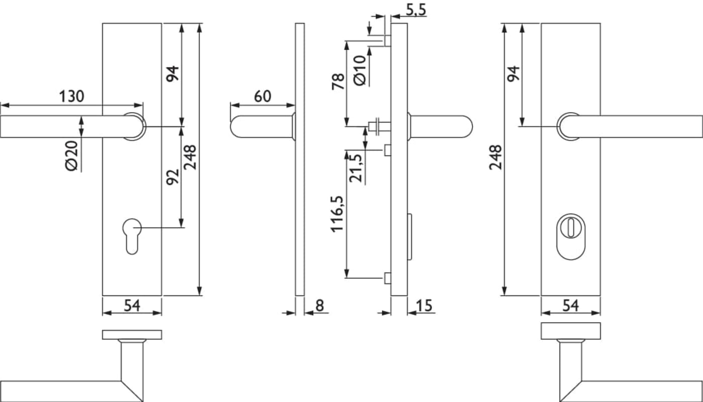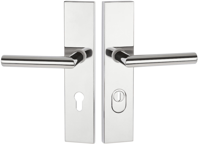 HT-EN2-Schutz-Drückergarnitur 1802 BASIC 02, mit Langschild 2094 KSH, Ausf.: PZ 92 mm, Türstärke 64 - 83 mm, mit Kernziehschutz für Zylinderüberstand 8 - 15 mm, Oberfl. 61 (Edelstahl poliert)