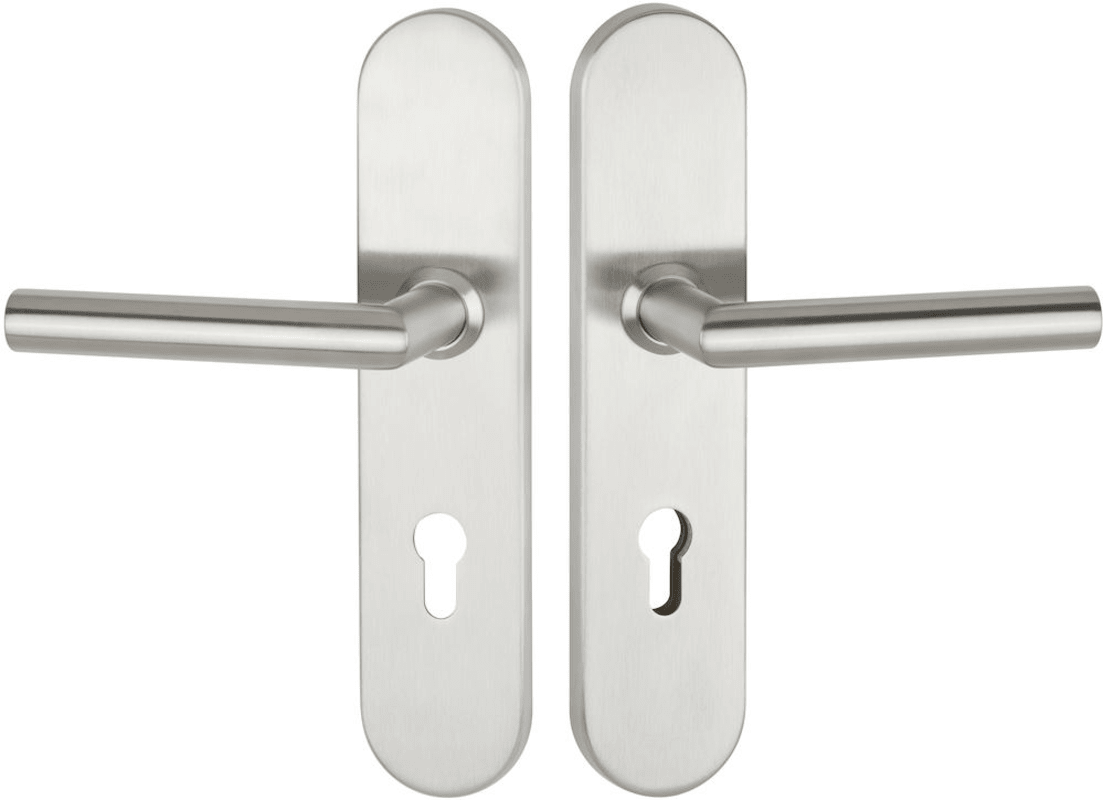 HT-EN2-Schutz-Drückergarnitur 1802 BASIC 02, mit Langschild 2091 SH, Ausf.: PZ 88 mm, Tst. 35 - 55 mm, Stift 8,5 mm, mit Anbohrschutz, Außenschildstärke 12 mm, Oberfl. 60 (Edelstahl matt)