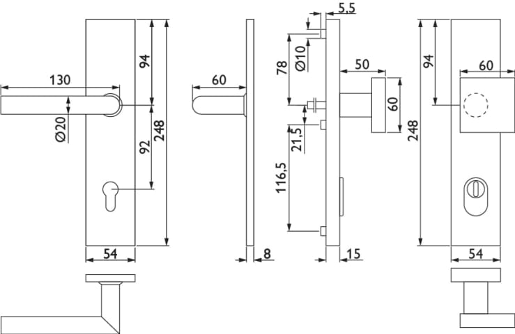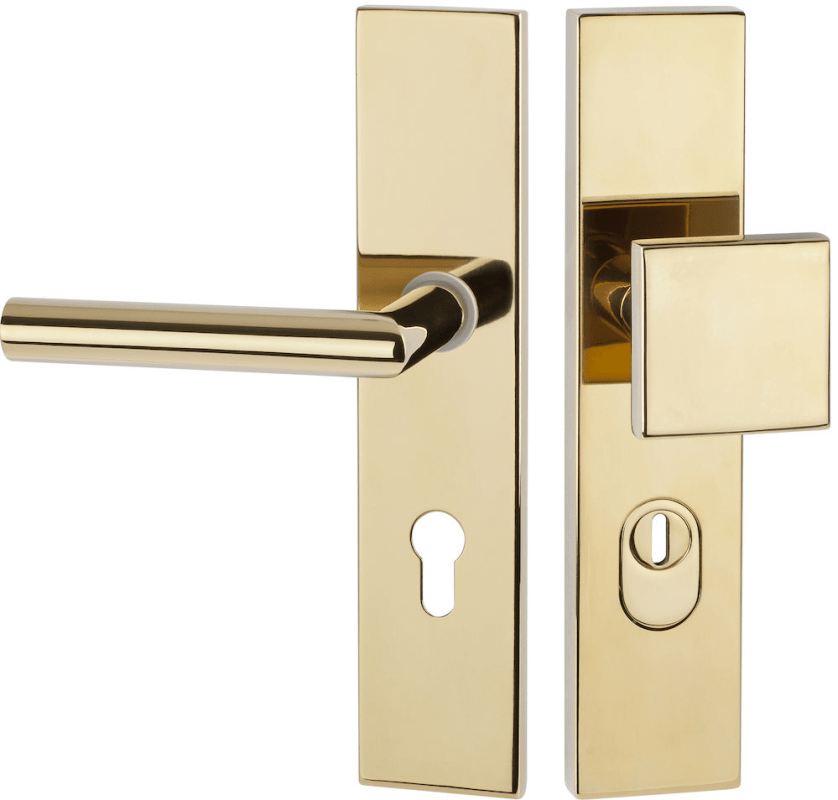 HT-EN2-Schutz-Wechselgarnitur 1802 BASIC 02, mit Langschild 2094 KSH, Knopf 3132 gekröpft, Ausf.: PZW 92 mm, Türstärke 64 - 83 mm, mit Kernziehschutz für Zylinderüberstand 8 - 15 mm, Oberfl. 18 (PVD M
