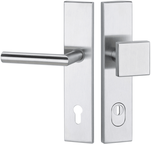 HT-EN2-Schutz-Wechselgarnitur 1802 BASIC 02, mit Langschild 2094 KSH, Knopf 3132 gekröpft, Ausf.: PZW 92 mm, Türstärke 64 - 83 mm, mit Kernziehschutz für Zylinderüberstand 8 - 15 mm, Oberfl. 60 (Edels