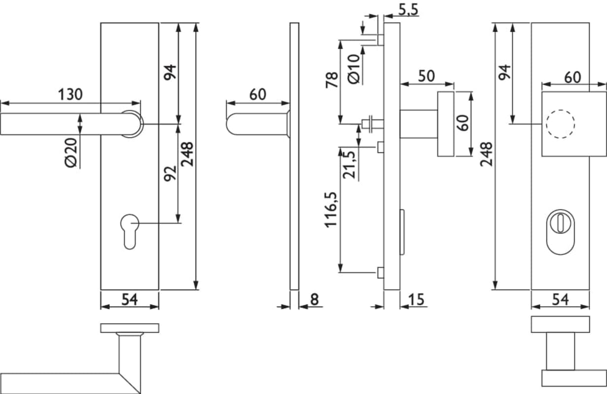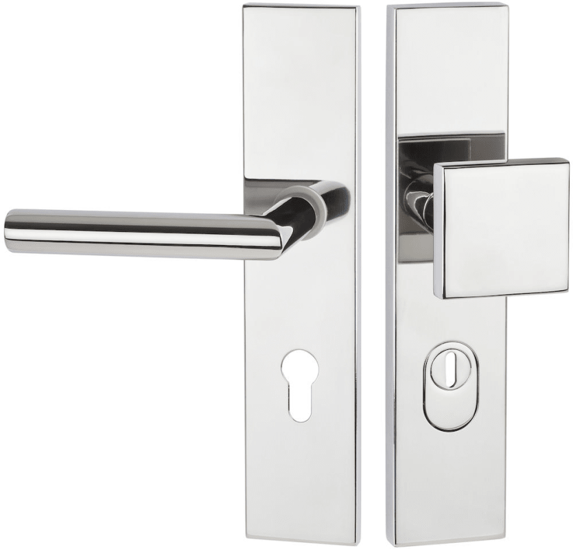 HT-EN2-Schutz-Wechselgarnitur 1802 BASIC 02, mit Langschild 2094 KSH, Knopf 3132 gekröpft, Ausf.: PZW 92 mm, Türstärke 64 - 83 mm, mit Kernziehschutz für Zylinderüberstand 8 - 15 mm, Oberfl. 61 (Edels