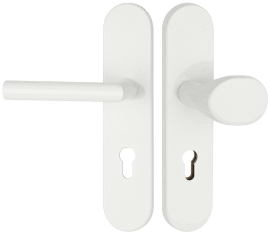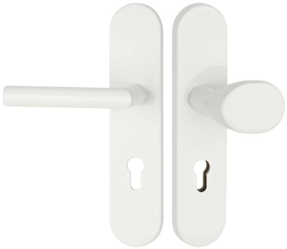 HT-EN2-Schutz-Wechselgarnitur 1902 BASIC 02, mit Langschild 2091 SH, Knopf 3128 gekröpft, Ausf.: PZW 92 mm, Türstärke 60 - 80 mm, mit Anbohrschutz, Außenschildstärke 12 mm, Oberfl. 41 (weiß)