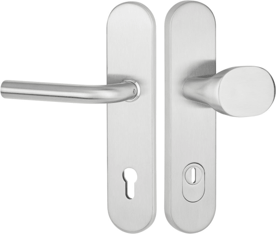HT-EN2-Schutz-Wechselgarnitur 1803 BASIC 03, mit Langschild 2089 KSH, Knopf 3128 gekröpft, Ausf.: PZW 92 mm, Türstärke 64 - 83 mm, mit Kernziehschutz für Zylinderüberstand 8 - 15 mm, Oberfl. 60 (Edelstahl matt)