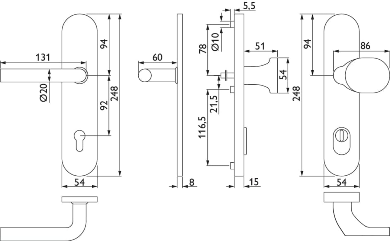 HT-EN2-Schutz-Wechselgarnitur 1803 BASIC 03, mit Langschild 2089 KSH, Knopf 3128 gekröpft, Ausf.: PZW 92 mm, Türstärke 64 - 83 mm, mit Kernziehschutz für Zylinderüberstand 8 - 15 mm, Oberfl. 60 (Edels