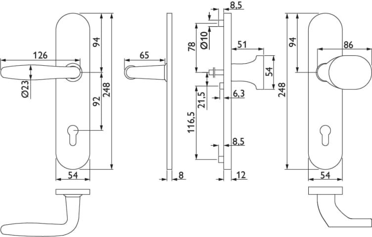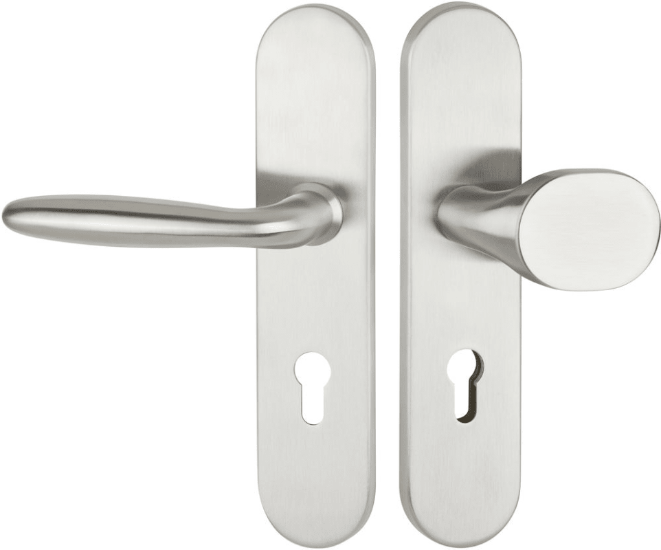 HT-EN2-Schutz-Wechselgarnitur 1931 DREAM, mit Langschild 2091 SH, Knopf 3128 gekröpft, Ausf.: PZW 92 mm, Türstärke 64 - 77 mm, mit Anbohrschutz, Außenschildstärke 12 mm, Oberfl. 60 (Edelstahl matt)