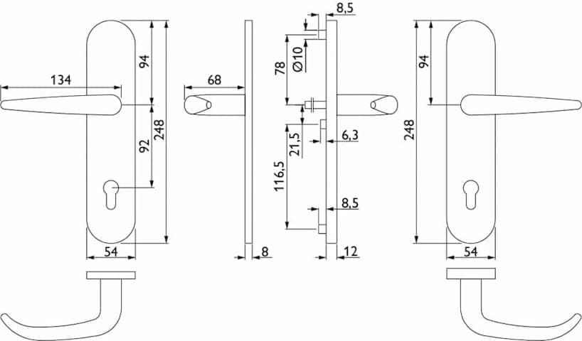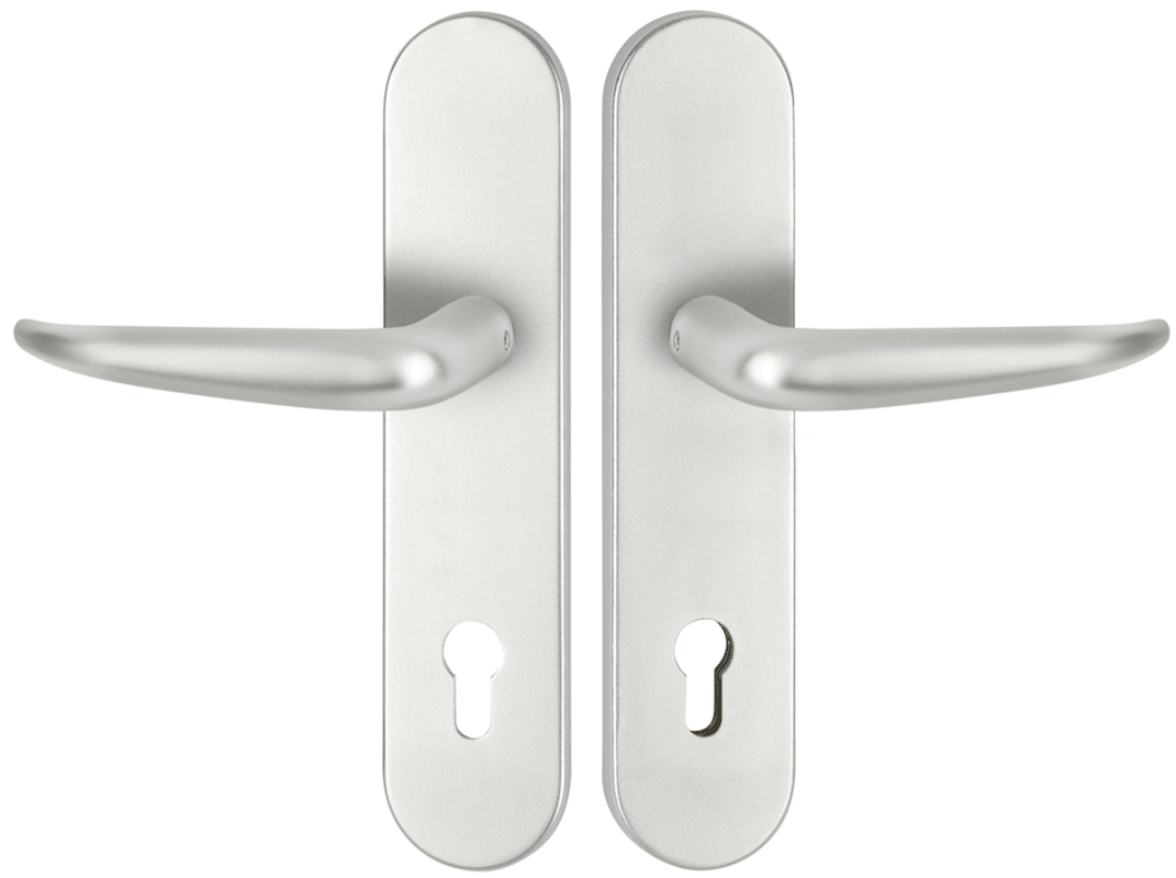HT-EN2-Schutz-Drückergarnitur 1906 BASIC 06, mit Langschild 2091 SH, Ausf.: PZ 92 mm, Türstärke 60 - 80 mm, mit Anbohrschutz, Außenschildstärke 12 mm, Oberfl. F1 (silberfarben eloxiert)