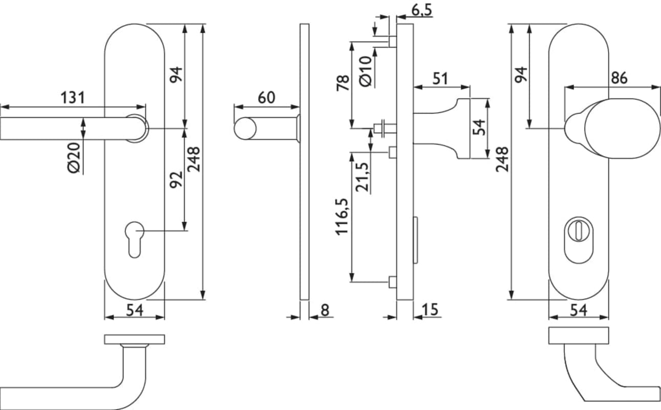 HT-EN3-Schutz-Wechselgarnitur 1803 BASIC 03, mit Langschild 2089 KSH, Knopf 3128 gekröpft, Ausf.: PZW 92 mm, Türstärke 64 - 83 mm, mit Kernziehschutz für Zylinderüberstand 8 - 15 mm, Oberfl. 60 (Edels