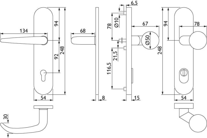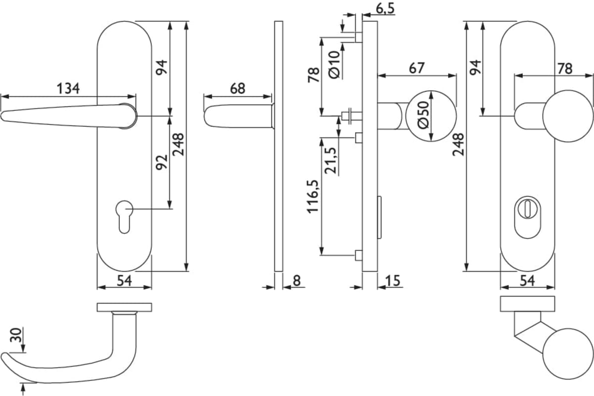 HT-EN3-Schutz-Wechselgarnitur 1806 BASIC 06, mit Langschild 2089 KSH, Knopf 3126 gekröpft, Ausf.: PZW 92 mm, Türstärke 64 - 83 mm, mit Kernziehschutz für Zylinderüberstand 8 - 15 mm, Oberfl. 60 (Edels