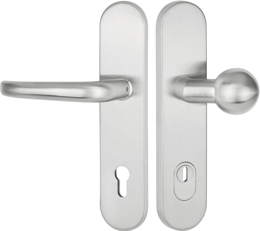 HT-EN3-Schutz-Wechselgarnitur 1806 BASIC 06, mit Langschild 2089 KSH, Knopf 3126 gekröpft, Ausf.: PZW 92 mm, Türstärke 64 - 83 mm, mit Kernziehschutz für Zylinderüberstand 8 - 15 mm, Oberfl. 60 (Edelstahl matt)