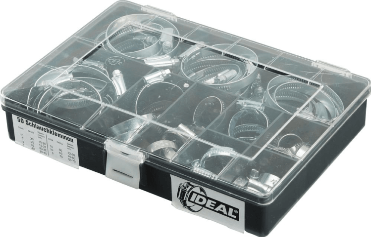 IDEAL®-Schlauchschellen-Sortiment• DIN 3017 • Material: W1 • 10 Stück, Typ 020, Spannbereich 12–20 mm • 7 Stück, Typ 025, Spannbereich 16–25 mm • 5 Stück, Typ 032, Spannbereich 20–32 mm • 5 Stück