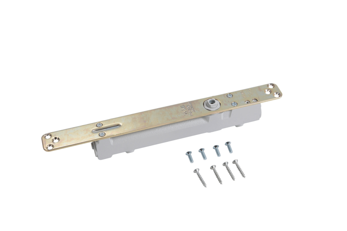 Integrierter Gleitschienentürschließer mit Endschlag und mechanischer Öffnungsdämpfung für nicht feuerzertifizierte Türen. DIN links.