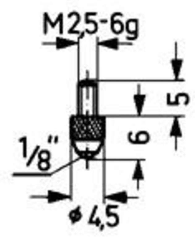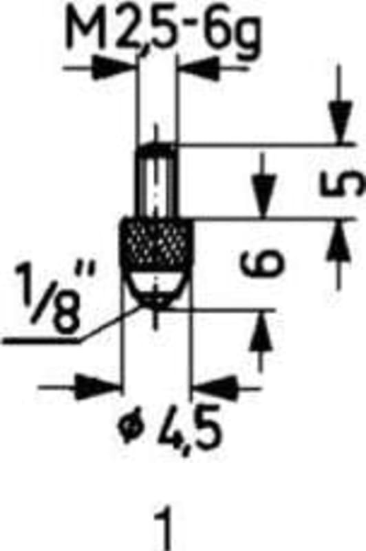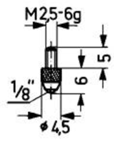 Messeinsatz aus StahlMesseinsatz für Messuhren und Feinzeiger mit Gewindeanschluss M2,5. Alle Messuhren und Feinzeiger werden standardmäßig mit Messeinsatz Nr. 1 aus gehärtetem Stahl geliefert.Messeinsätze mit Rubin- oder Saphirkugeln auf Anfrage.