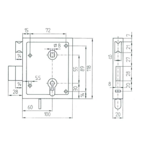 Universalkastenschloss mit schießender Falle, Buntbart 79 B (ohne Wechsel) oder vorgerichtet für Profilzylinder 79 P (mit Wechsel) , durch umlegbare Falle und geteiltem Schließkasten links, rechts, e