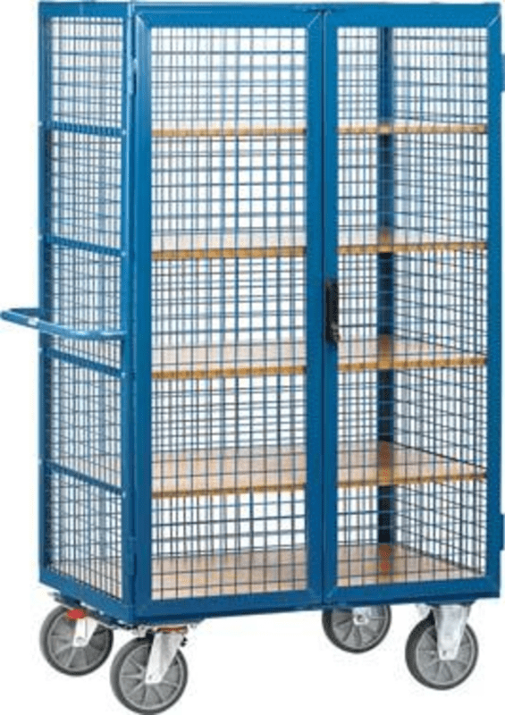 Kastenwagen (Drahtgritter) mit Türen und Treibriegelverschluss • Winkelstahl-Konstruktion: pulverbeschichtet • Mit Rohr-Schiebegriff • Drahtgitter: an Stirnwände, Längswände, Flügeltür, Dach mit Drahtgitter, 40 x 40 x 4 mm, komplett verschweißt • Treibriegel-Verschluss: Schwenkhebel, Zylinderschloss • Böden: 1x fest, 4x variabel, zum Einlegen im Raster von 100 mm • Bodenmaterial: Sandwich-Platten, tragfähig, biegesteif, Oberflächen Buchendekor • Tragkraft: 90 kg pro Boden • Rollen: 2 Bockrollen, und 2 Lenkrollen mit TOTALSTOP-Zentralbremssystem serienmäßig an den Lenkrollen, gemäß der Europäischen Norm EN 1757-3 (Sicherheit von Plattformwagen) • Räder: TPE-Bereifung, leichtlaufend • Naben: Präzisions-Rillenkugellager • Zentralbremssystem: serienmäßig