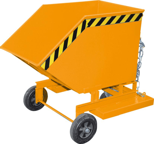 Kastenwagen, Typ KW-ET • Material: Stahlblech, öl- und wasserdicht verschweißt, mit Randverstärkung • Grundrahmen: aus Profilstahl, Federkippsicherung • Einfahrtaschen: mit Sicherung gegen unbeabsichtigtes Abrutschen und Auskippen • 2 Räder und eine Lenkrolle, ab Inhalt 600 l mit 2 Lenkrollen, davon eine Lenkrolle mit Feststeller, Schiebegriff • Räder aus Vollgummi, Ø 250 x 60 mm