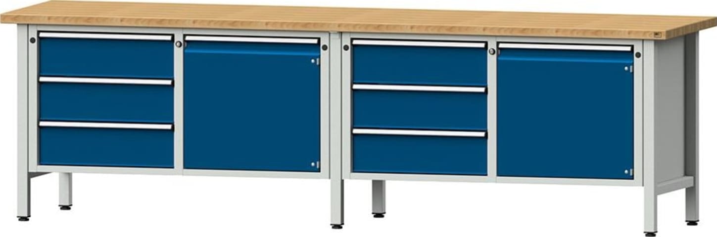 Kastenwerkbank, Serie V, Schubladen, Tür • Gesamttraglast: 1500 kg • Werkbankplatte: Buche massiv, längsseits riegelartig zahnverleimt, Oberfläche geölt • Zentralverschluss: Zentralschließung (Wechselzylinder) mit 2 Schlüsseln. Auf Anfrage durch Tausch des Schließkerns Einbindung der ANKE-Werkbank in DOM®-Schließanlage möglich • Füße: 4-kant-Stahlrohr, 45/45/2 mm • Schubladen: Vollauszug 100 %, Schlitzwände und Lochböden zur individuellen Unterteilung, Einzelauszugsperre • Schubladentraglast: 100 kg • Türen: Fronthöhe 540 mm, Türöffnungsweite 180°, Versteifungsprofile, Scharniere mit Zuhaltung • Niveauausgleich: 1 • Lackierung: Fronten RAL 5010 enzianblau, Gestell/Gehäuse RAL 7035 lichtgrau Lieferung: Komplett montiert.