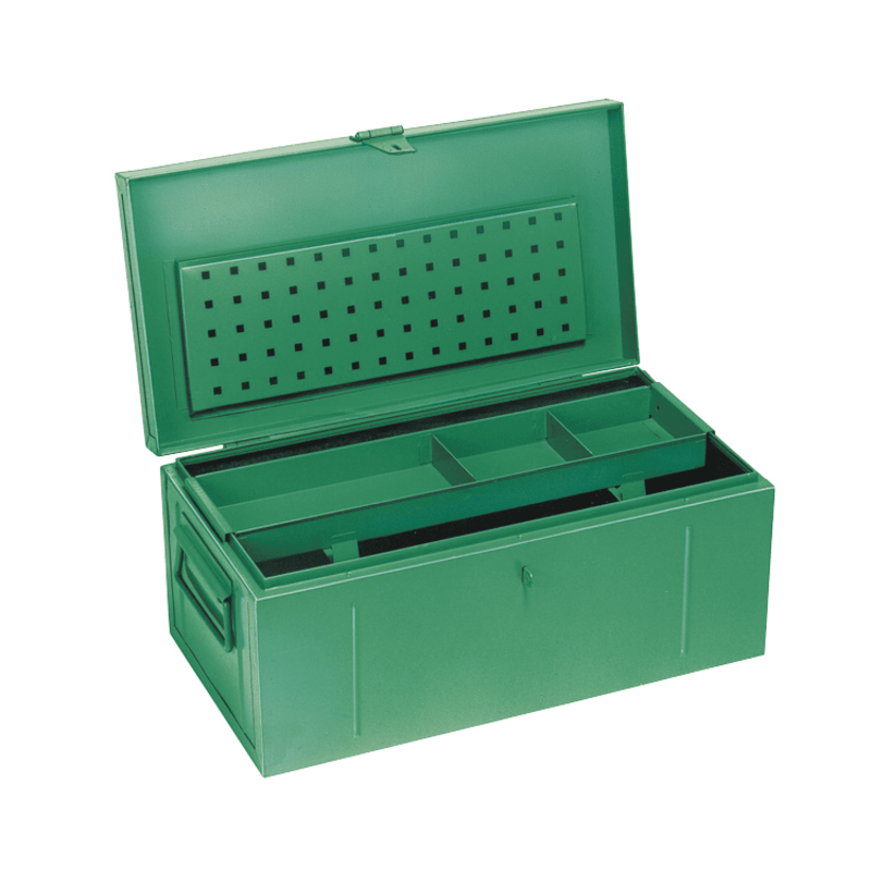 Stahlblech-Montagekoffer • Stabil und wetterfest • Pulverbeschichtet • Mit herausnehmbarem Einsatz für Kleinteile • Mit Hartfaser-isolierter Innenverkleidung • Breite Tragegriffe • Mit Vorhängeschloss abschließbar