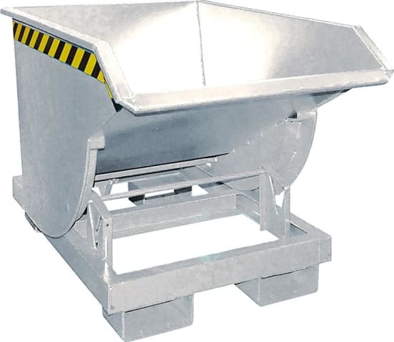 Kippbehälter Typ BKM, mit Abrollsystem • Wanne: aus Stahlblech mit umlaufendem Randprofil • Grundrahmen: aus Stahl mit Einfahrtaschen • Kompakte Bauform • Günstiger Lastschwerpunkt • Kippen in jeder Höhe per Seilzug vom Staplersitz aus möglich • Sicherung gegen unbeabsichtigtes Abrutschen und Auskippen