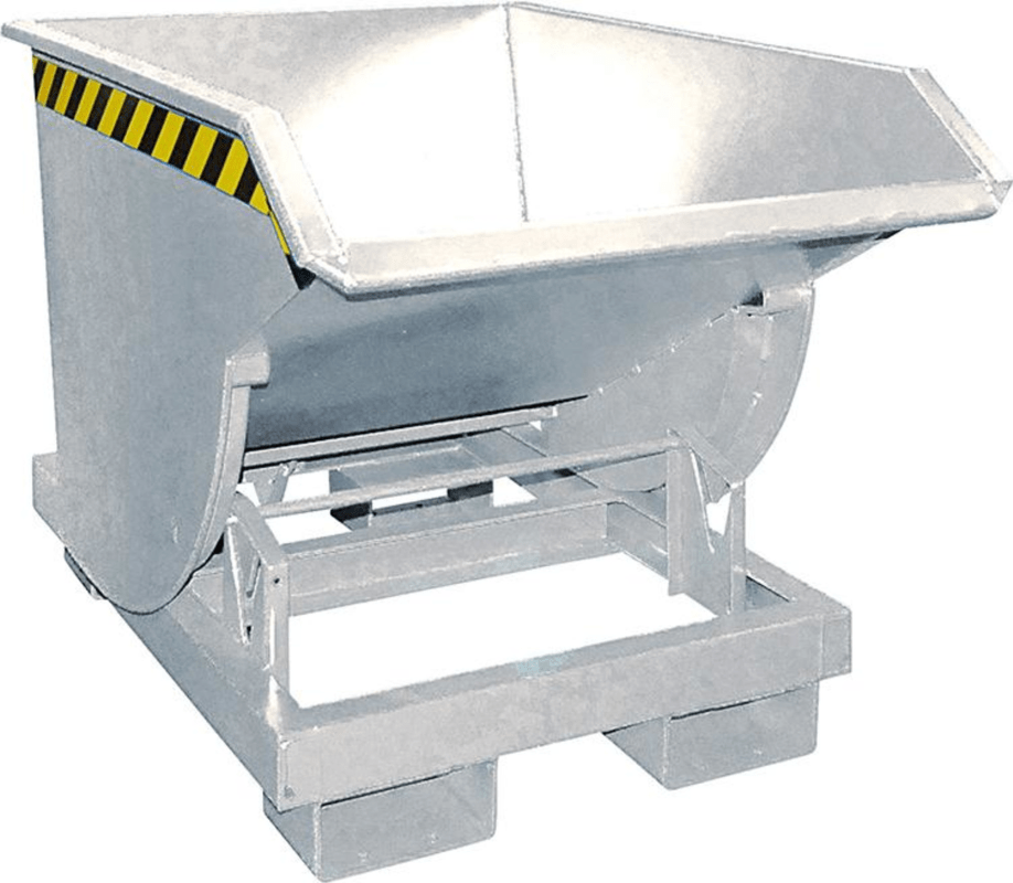Kippbehälter Typ BKM, mit Abrollsystem • Wanne: aus Stahlblech mit umlaufendem Randprofil • Grundrahmen: aus Stahl mit Einfahrtaschen • Kompakte Bauform • Günstiger Lastschwerpunkt • Kippen in jeder
