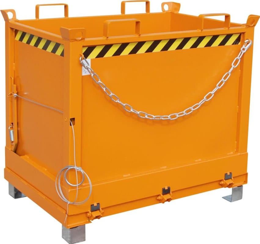 Klappbodenbehälter Typ FB • Material: robuste Stahlkonstruktion mit glatten Innenwänden • Mit Gummifederung, die das Herunterschlagen der Bodenklappe bei der Entleerung dämpft • Entriegelung der Bod