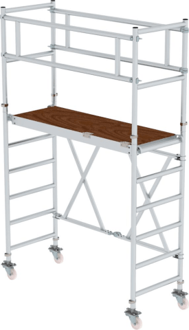 Klappgerüst, Arbeitshöhen 3,80 - 13,80 m • Gerüstteile: Aluminium-Rundrohr • Klapprahmen: aus Rechteckrohr-Holmen mit selbstarretierenden Scharnieren • Plattform: trittsicher • Grundeinheit: Auf-, Abbau mit wenigen Handgriffen, zusammenklappbar, passt durch jede Standardtür • Traglast: Lastklasse/Gerüstgruppe II, 1,5 kN/m² • Beräderung: Lenkrollen mit Spindeln und Feststellbremse, Durchmesser 125 mm • GS-geprüft: entspricht BetrSichV, lt. DIN EN 1004 entsprechen die Ausbauversionen Gerüstgruppe II Lieferung: Alle Teile für ein sicheres Arbeiten (abhängig von Gerüsthöhe). Hinweis: Die erforderliche Anzahl an Ballastgewichten hängt von der Aufbauart, dem Aufbauort und der Gerüsthöhe ab. Die Aufbau- und Gebrauchsanleitung gibt Ihnen dazu ausführliche Informationen. Als Lastklasse wird die Summe der gleichmäßig verteilten Verkehrslasten auf einem Gerüstfeld bezeichnet.  Lastklasse/Gerüstegruppe II: Diese Klasse ist nicht für die Lagerung von Werkstoffen und Material zu verwenden, es sei denn, es handelt sich um ein kurzfristiges Abstellen geringer Lasten (beispielsweise für Putz-, Anstreich-, Verfug- oder Wartungsarbeiten).