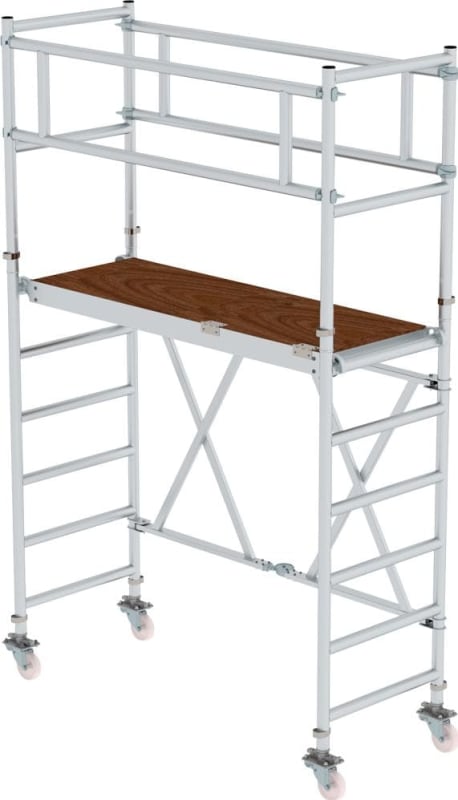 Klappgerüst, Arbeitshöhen 3,80 - 13,80 m • Gerüstteile: Aluminium-Rundrohr • Klapprahmen: aus Rechteckrohr-Holmen mit selbstarretierenden Scharnieren • Plattform: trittsicher • Grundeinheit: Auf-, Ab