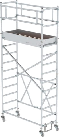 Klappgerüst, Arbeitshöhen 3,80 - 13,80 m • Gerüstteile: Aluminium-Rundrohr • Klapprahmen: aus Rechteckrohr-Holmen mit selbstarretierenden Scharnieren • Plattform: trittsicher • Grundeinheit: Auf-, Abbau mit wenigen Handgriffen, zusammenklappbar, passt durch jede Standardtür • Traglast: Lastklasse/Gerüstgruppe II, 1,5 kN/m² • Beräderung: Lenkrollen mit Spindeln und Feststellbremse, Durchmesser 125 mm • GS-geprüft: entspricht BetrSichV, lt. DIN EN 1004 entsprechen die Ausbauversionen Gerüstgruppe II Lieferung: Alle Teile für ein sicheres Arbeiten (abhängig von Gerüsthöhe). Hinweis: Die erforderliche Anzahl an Ballastgewichten hängt von der Aufbauart, dem Aufbauort und der Gerüsthöhe ab. Die Aufbau- und Gebrauchsanleitung gibt Ihnen dazu ausführliche Informationen. Als Lastklasse wird die Summe der gleichmäßig verteilten Verkehrslasten auf einem Gerüstfeld bezeichnet.  Lastklasse/Gerüstegruppe II: Diese Klasse ist nicht für die Lagerung von Werkstoffen und Material zu verwenden, es sei denn, es handelt sich um ein kurzfristiges Abstellen geringer Lasten (beispielsweise für Putz-, Anstreich-, Verfug- oder Wartungsarbeiten).