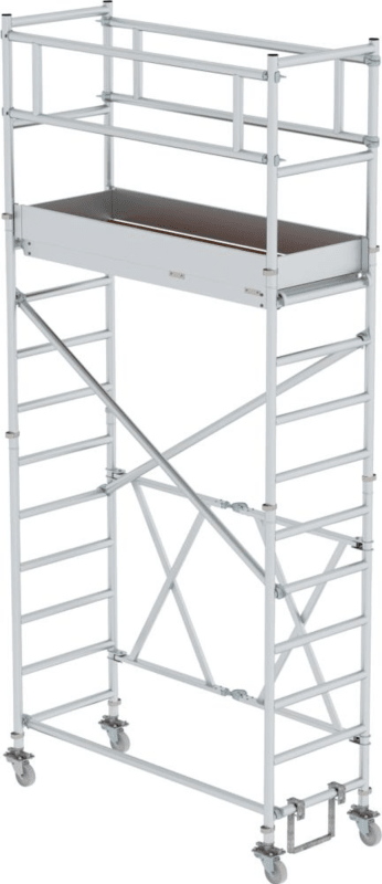 Klappgerüst, Arbeitshöhen 3,80 - 13,80 m • Gerüstteile: Aluminium-Rundrohr • Klapprahmen: aus Rechteckrohr-Holmen mit selbstarretierenden Scharnieren • Plattform: trittsicher • Grundeinheit: Auf-, Ab
