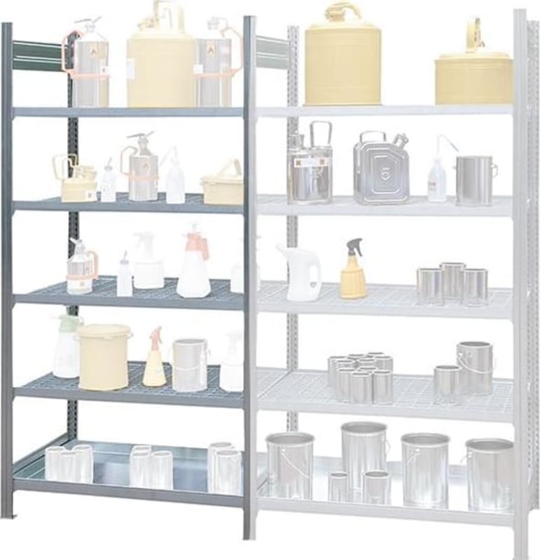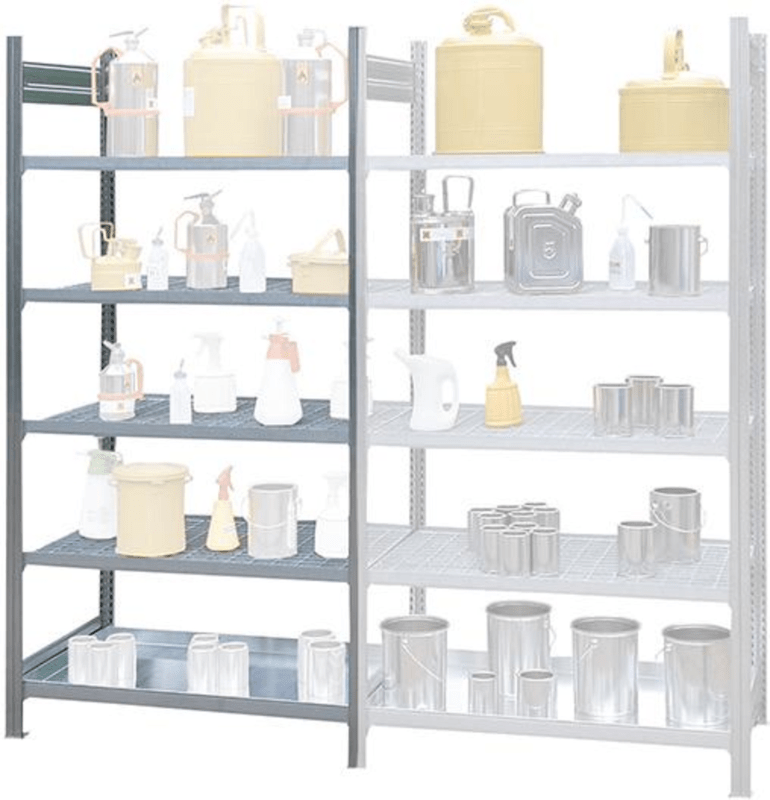 Kleingebinde-Gefahrstoffregal für brennbare Flüssigkeit • Oberfläche: verzinkt • Raster Höhenverstellung: 25 mm • Aussteifung: Traversen • Beidseitig nutzbar • GHS-Kategorie: 1–3 Lieferung: Regal mit 1 Auffangwanne, entsprechend WHG unten und 4 Gitterrostebenen. Hinweis: Beliebig erweiterbar durch Grund- und Anbaufelder.