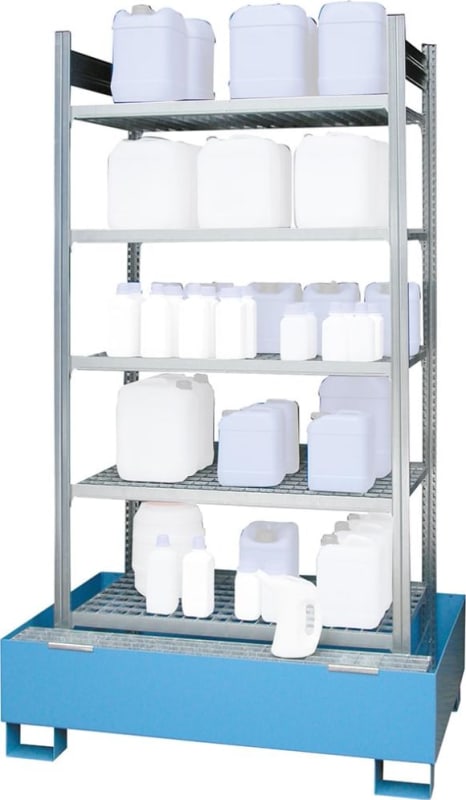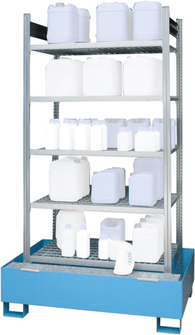 Kleingebinde-Gefahrstoffregal, mit Standwanne • Regal Oberfläche: verzinkt • Einlegeböden: aus Gitterrosten • Raster Höhenverstellung: 25 mm • Aussteifung: Traversen • Bodenfreiheit der Wannen: 100 mm • Einfachen Transport mit Hubgeräten • Beidseitig nutzbar Hinweis: Zur vorschriftsmäßigen Lagerung von wassergefährdenden und entzündbaren Stoffen. Großes Auffangvolumen durch die Kombination von Standwannen (entspricht WHG) und Regalen.